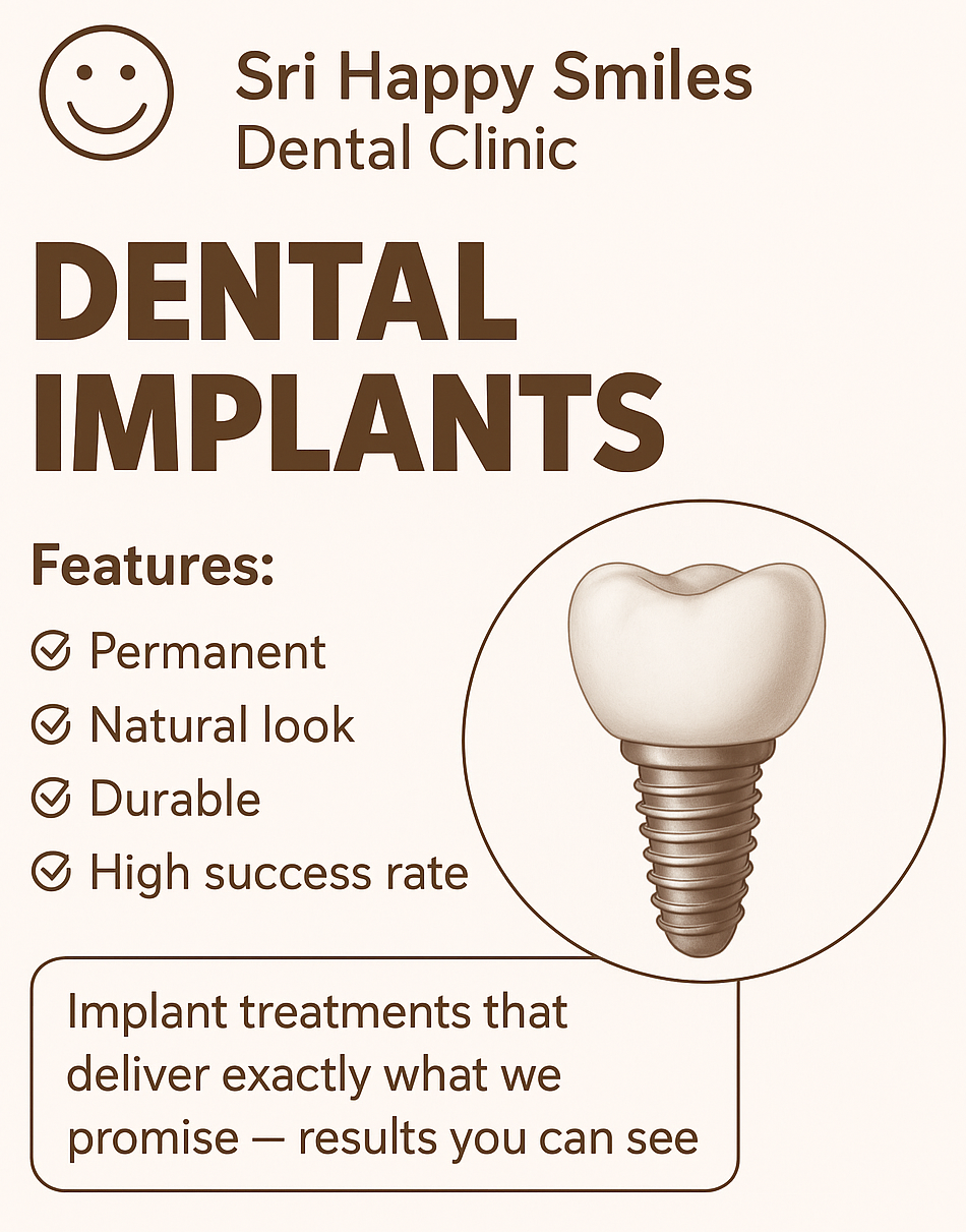 Dental Implants in Begumpet, Hyderabad – Sri Happy Smiles Dental Clinic At Sri Happy Smiles Dental Clinic, Begumpet, Hyderabad, we offer advanced and long-lasting Dental Implant treatment to replace missing teeth and restore your natural smile. Dental implants are the most reliable solution for replacing one or more missing teeth, providing excellent function, comfort, and aesthetics. Our clinic uses high-quality implant systems, digital planning, and modern surgical techniques to ensure precise placement and faster healing. Dental implant procedures are performed by experienced implant specialists under strict sterilization protocols for safe and predictable outcomes. Dental implants help improve chewing efficiency, speech, facial appearance, and prevent bone loss caused by missing teeth. Whether you need a single tooth implant, multiple implants, or full-mouth rehabilitation, we offer personalized treatment plans tailored to your needs. Why choose Sri Happy Smiles Dental Clinic for Dental Implants? • Advanced and painless implant procedures • Experienced implant specialists • Premium quality implant systems • Long-lasting and natural-looking results • Trusted dental clinic in Begumpet, Hyderabad Book your consultation today at Sri Happy Smiles Dental Clinic for reliable and affordable Dental Implants in Begumpet, Hyderabad, and regain your confident smile. To book appointment 📞📞📞 90597 34531